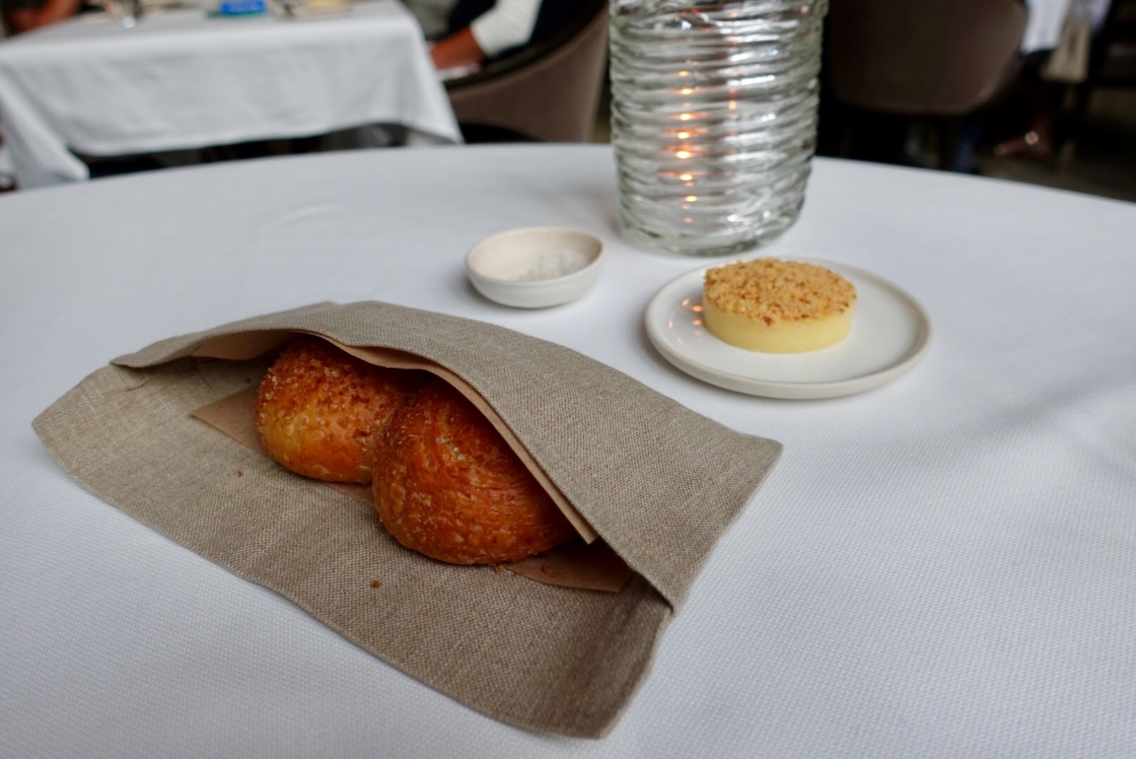The main-dining room – where you can have the full tasting menu – is dominated by a huge blue painting by Rita Ackerman, an abstraction of the Madison Park. The heavy mustardy-woods and black leather furniture made place for banquettes lining the space. These and other furnishings are kept in muted neutral colors (light blue-gray and earthy brown). The atmosphere is pleasant, the high-ceilinged Art Deco space has plenty of windows. It feels grand and intimate at the same time. The latter probably because the room is partitioned, and the tables are not too close to the next one.